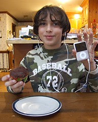 As you can see he is very pleased with the iPod. He has being bugging us for quite some time about getting his own MP3 player. He has quite a collection of tunes on Larry's computer and was severely limited on when he could listen to his music. Now he is free to listen all the time.