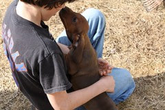 This week's artist is Jake. He is pictured with one of the puppies we saw this past Monday, I think it's the shaded red boy that is being called DJ (as in Dell junior- he looks a lot like his uncle Dell).